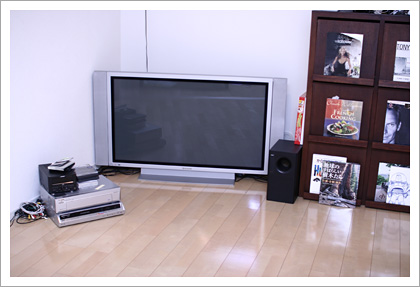 テレビは床にじか置き、テレビチューナー、HDD,DVDプレーヤー、ステレオも床にじか置き