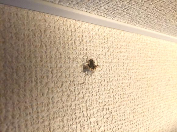 今回、補修した穴は直径3mmぐらいの大きさです。ネジが壁からもぎ取れたので、穴の周りが出ていますね。